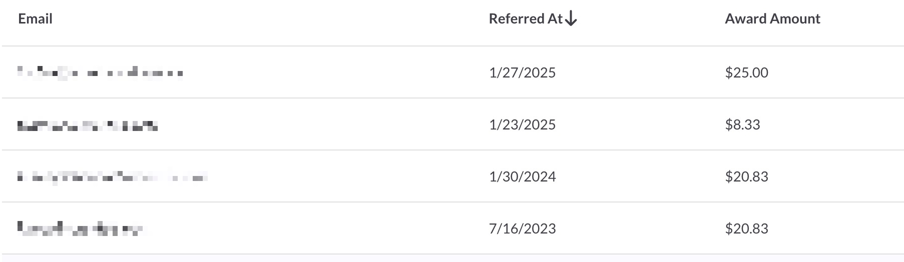The Referrals page shows your total credits earned and a table of everyone you've referred.
