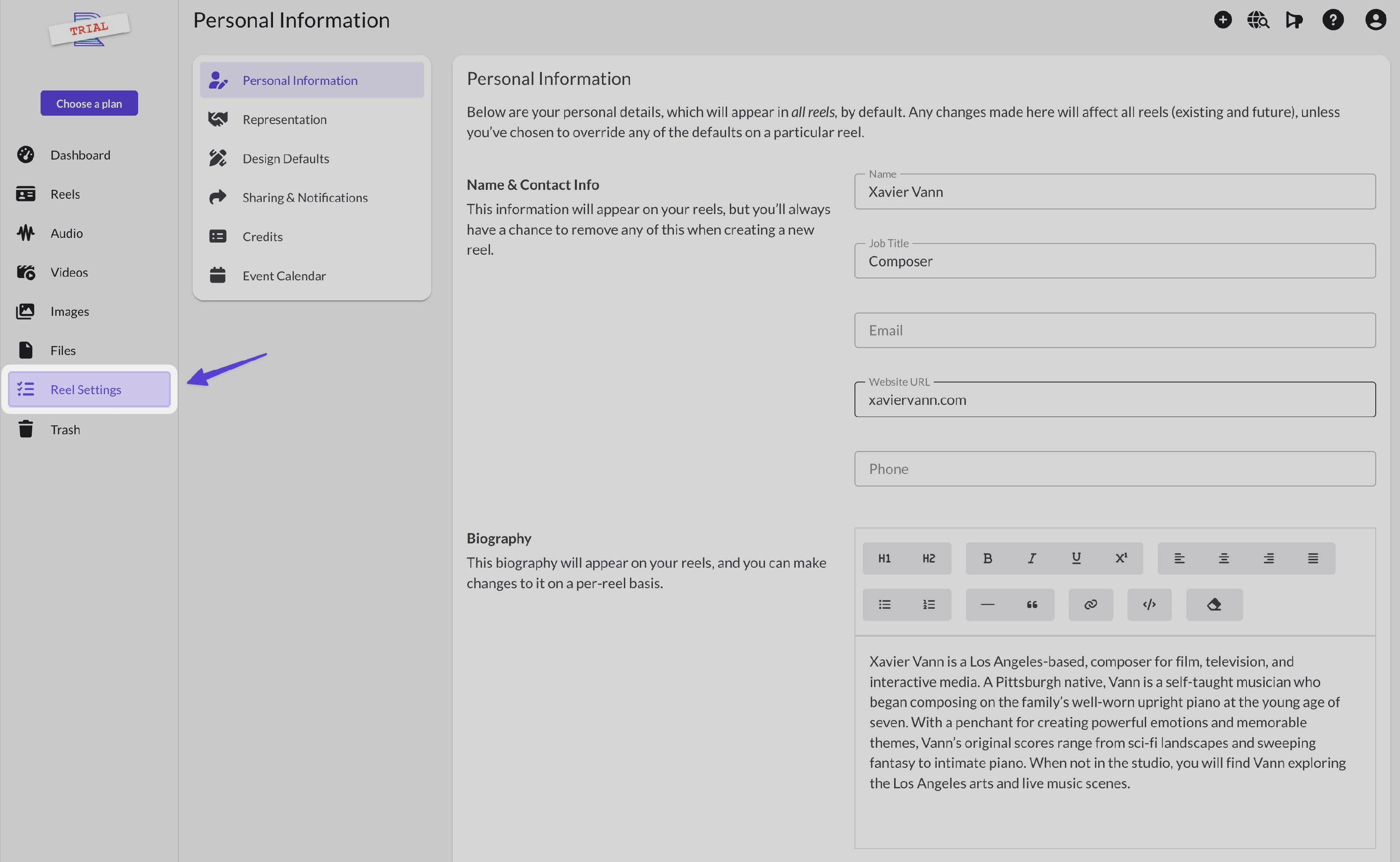 Go to Reel Settings in the left sidebar (just above Trash).