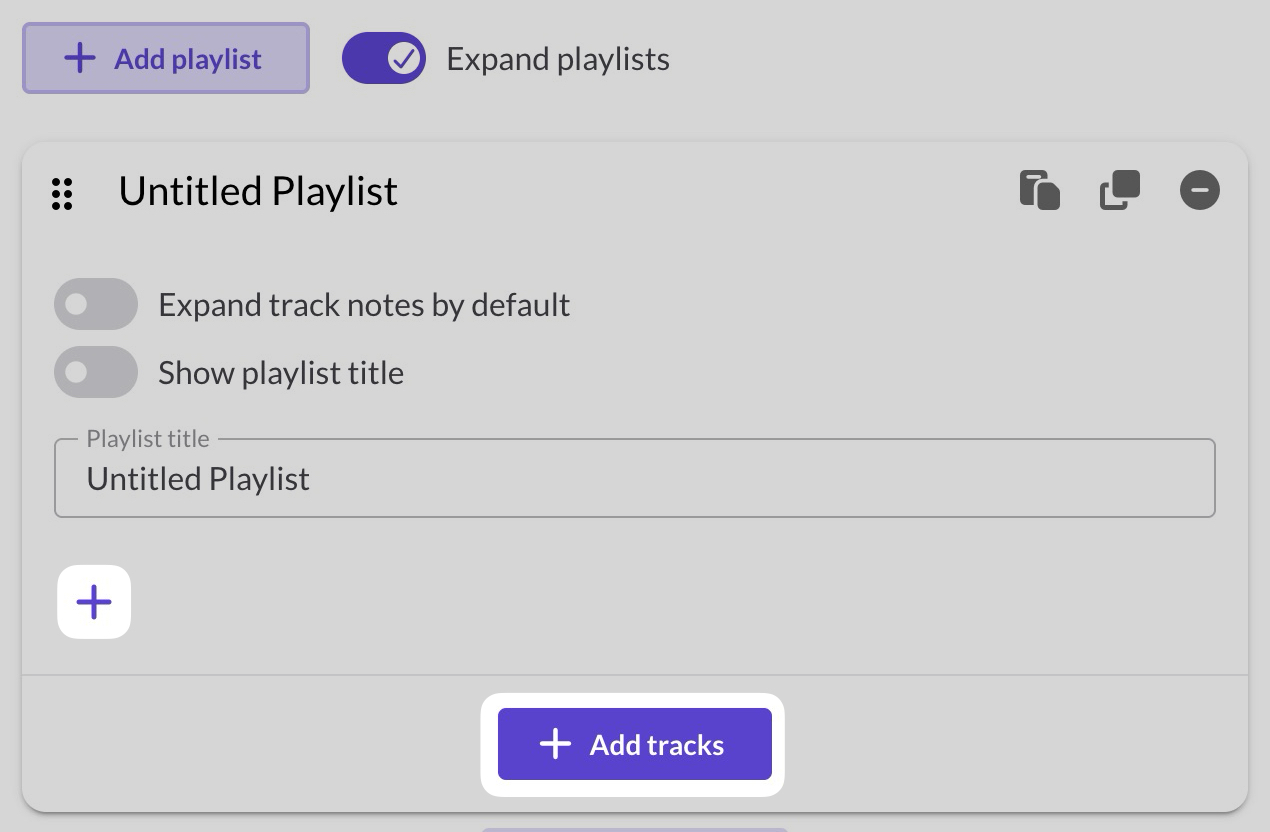 Click Add playlist, then Add tracks. Select tracks from your library or upload new ones.