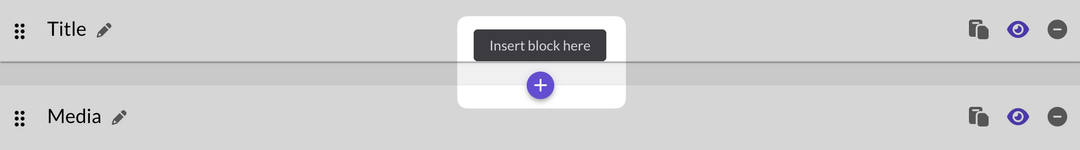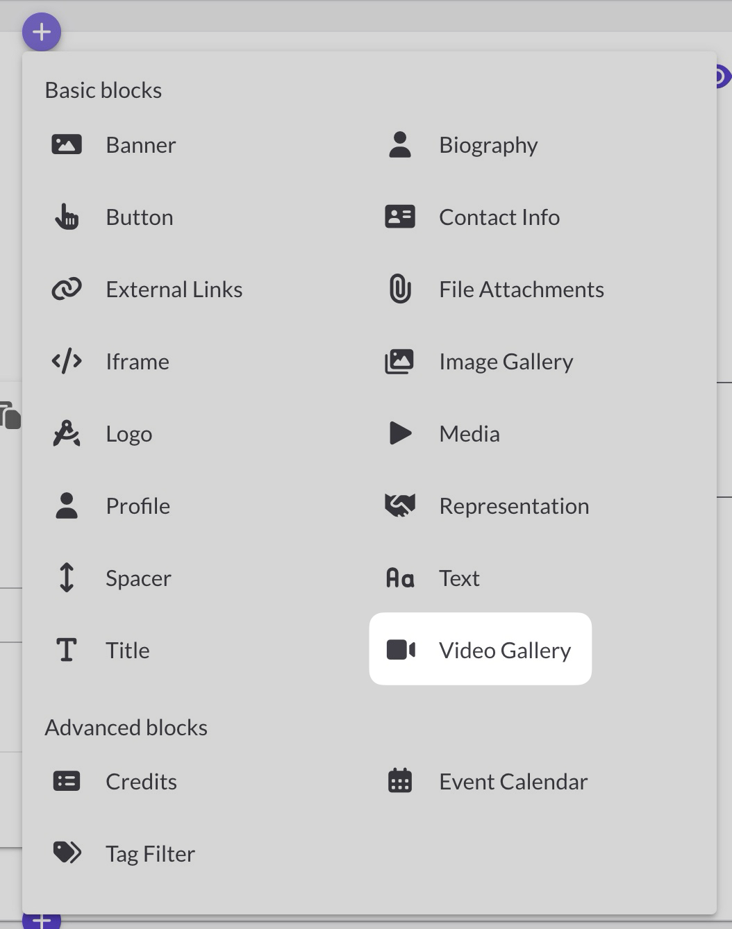 To add a Video Gallery, click the + icon between blocks and select Video Gallery.
