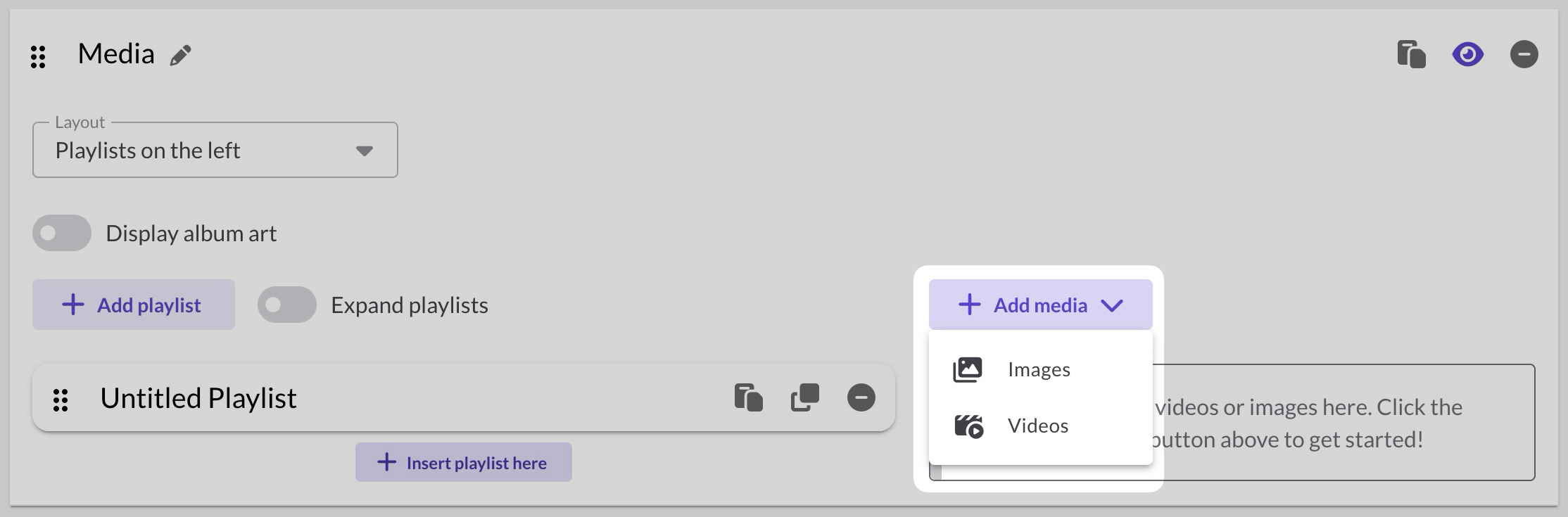 - Media block: Add full-size videos, or half-column videos alongside your audio tracks