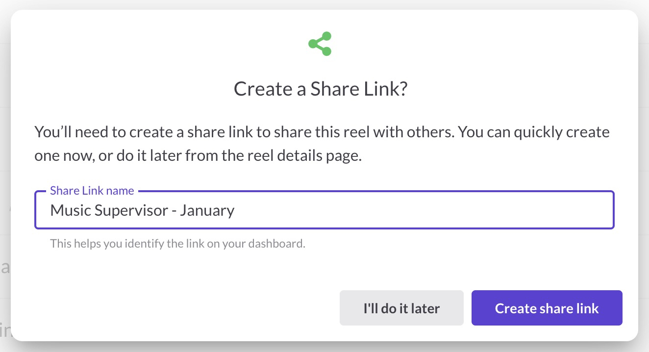 Click Save and publish. You’ll be asked to name your share link — this is just for you to identify it later (like “Music Supervisor – January”).