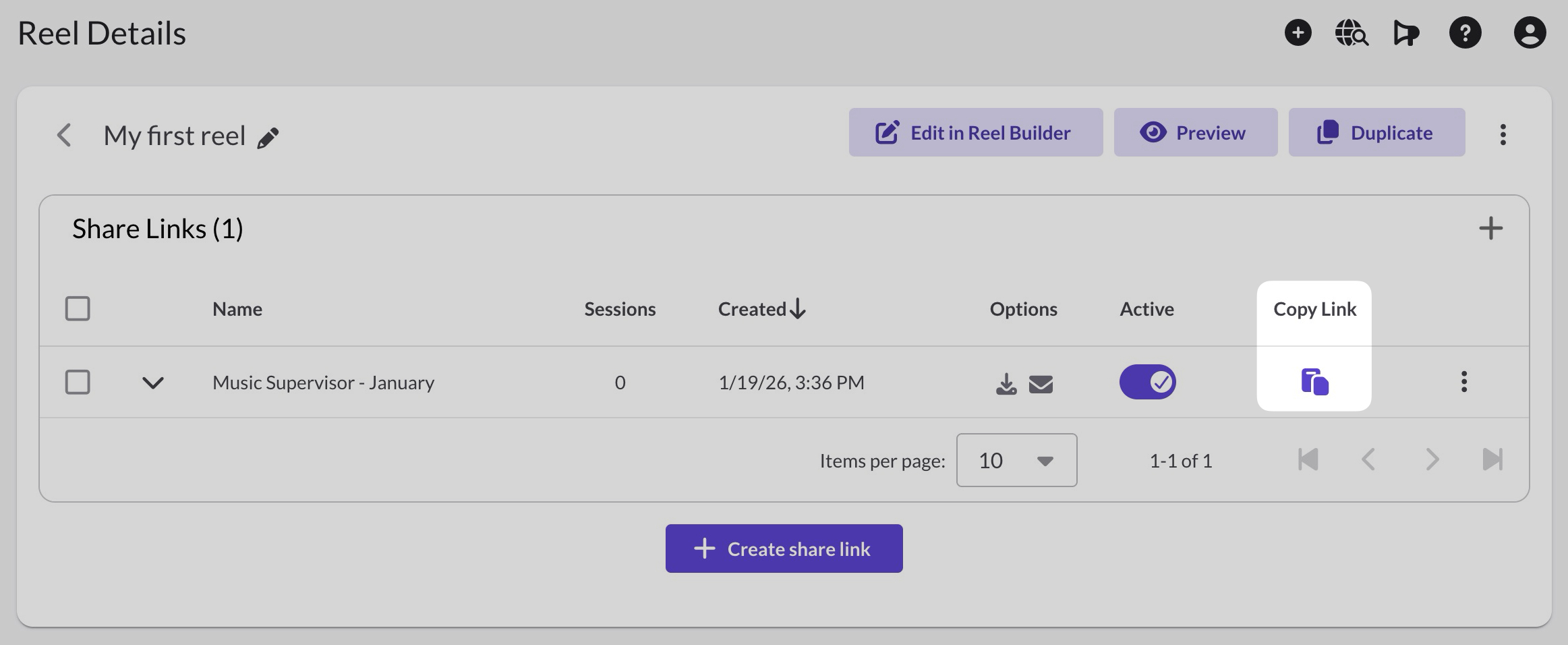 Click Create share link. You’ll land on the reel detail page with your new link ready to copy.
