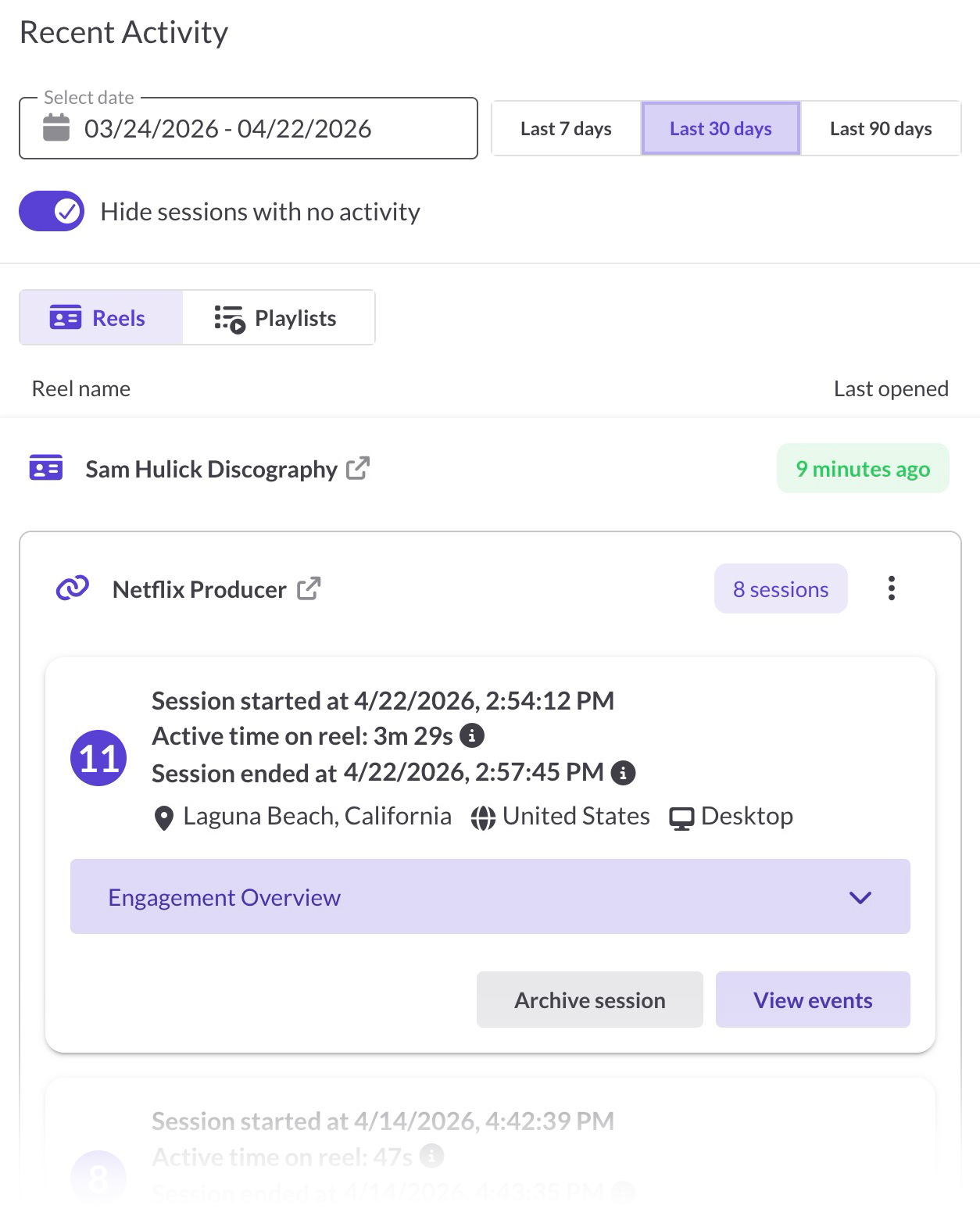 Recent Activity on your Dashboard shows how people engage with your reels and playlists. Every time someone opens a share link, ReelCrafter creates a session and tracks what they do: what they play, how long they stay, and what they click or download.