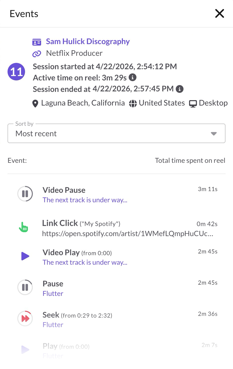 Session end time is when the visitor closed your reel or navigated away. In most cases this is precise. If the session closes abnormally (like a browser crash), the end time may be up to 10 minutes later than when they actually left.