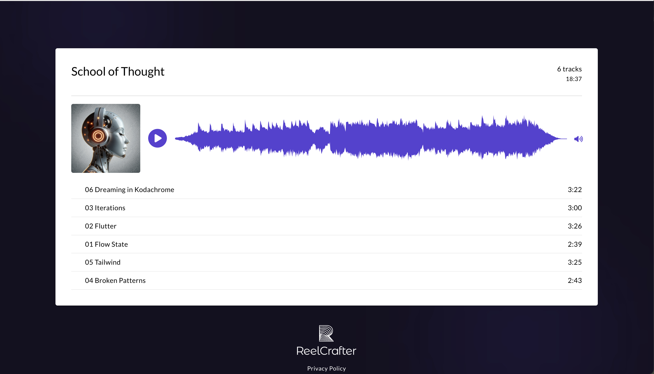 Recipients see a clean, focused player with your playlist title (if enabled), album art, a waveform player, and your track list. The page is ReelCrafter-branded: your logo and colors don't appear on playlists.