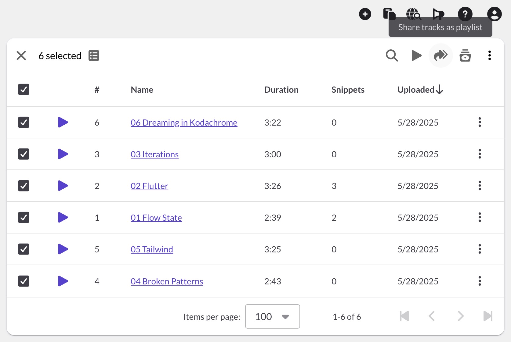 This method creates the playlist, adds your selected tracks, and generates a playlist link, all in one step. You'll see the link URL immediately and can copy it to send.
