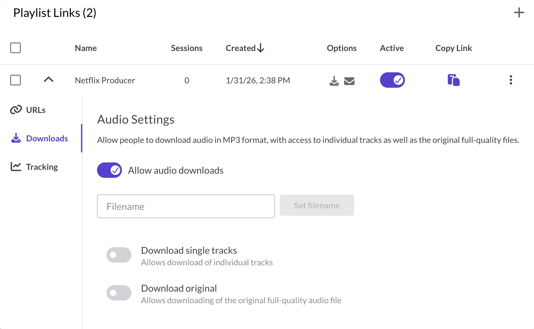 Free and Starter plans can create one link per playlist. Professional plans can create unlimited links with individual download and tracking settings for each.