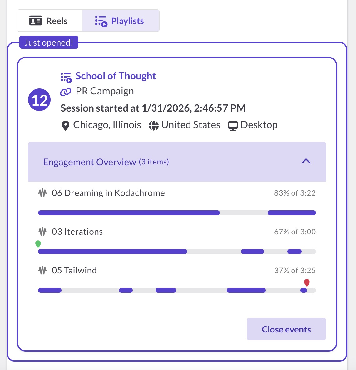 Go to Dashboard and click the Playlists tab in Recent Activity. You'll see sessions grouped by playlist, then by link. Expand any session to see the Engagement Overview showing which tracks were played.