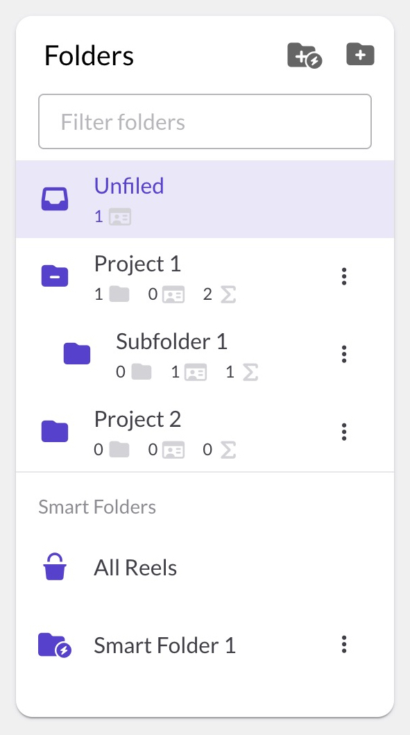 ReelCrafter's libraries (Playlists, Reels, Audio, Video, Images, and Files) each have their own folder system. Folders work the same way across all libraries.