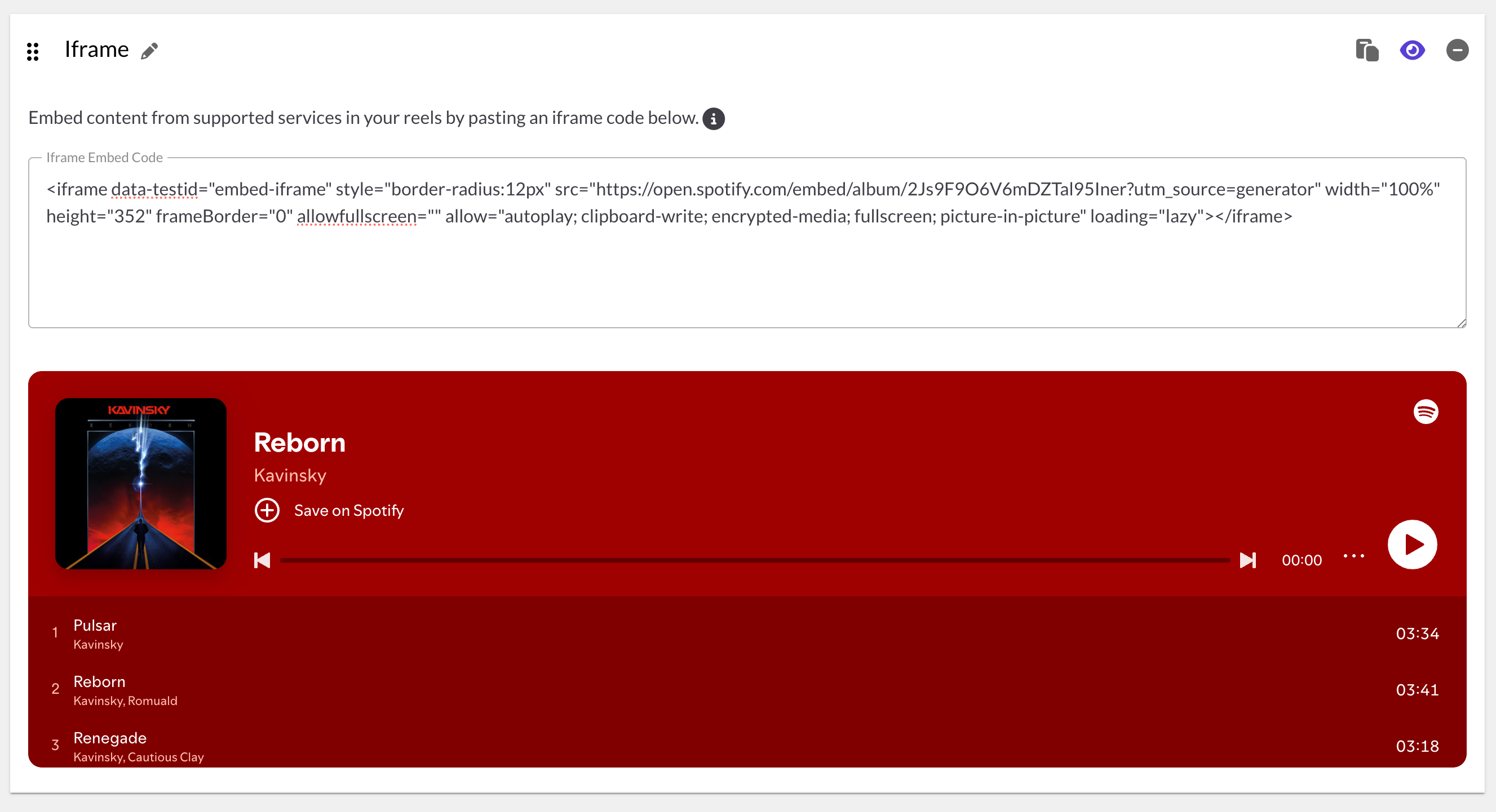 The Iframe block lets you embed content from supported services directly into your reel. Use it to add Spotify players, Bandcamp albums, Google Docs, and more.