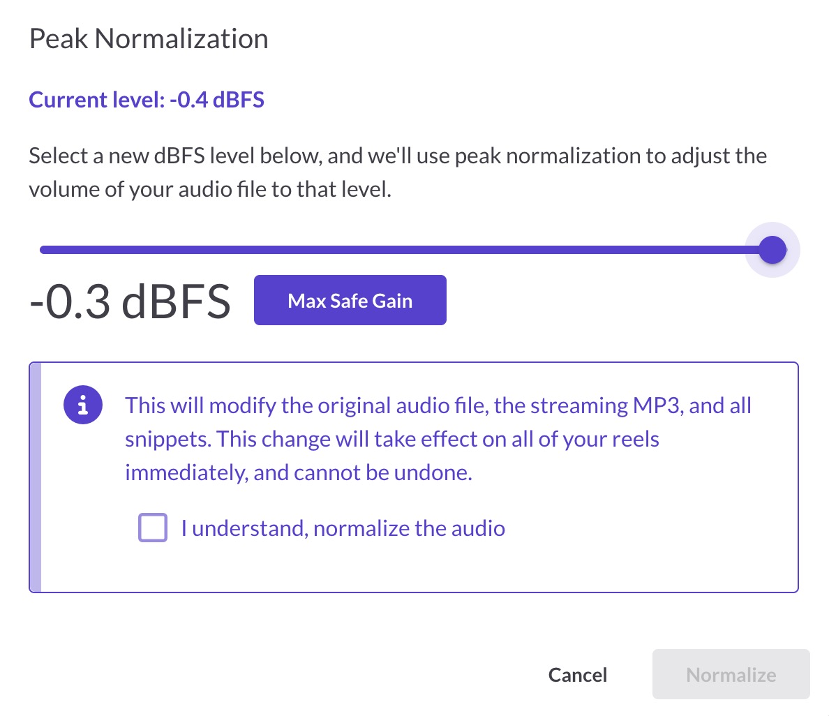 Peak normalization adjusts the volume of your audio file to reach a target level. For the best results, normalize in your DAW before uploading. But if you've already uploaded a track and need to adjust its level, this feature can help without requiring a re-upload. Note that this edits the track itself across all reels, it doesn't adjust levels relative to other tracks within a reel.