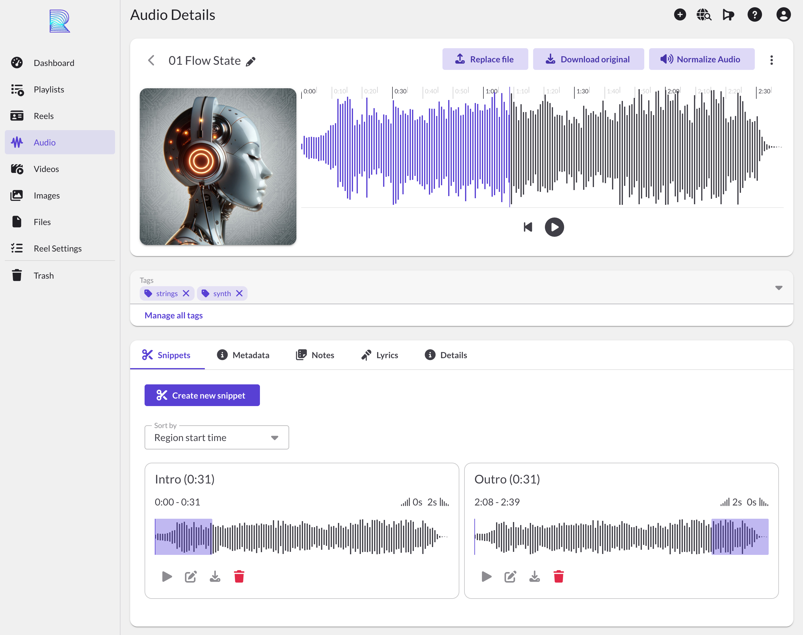 - Replace file: Swap the audio file while keeping snippets, tags, and reel placements. See Replace audio file.