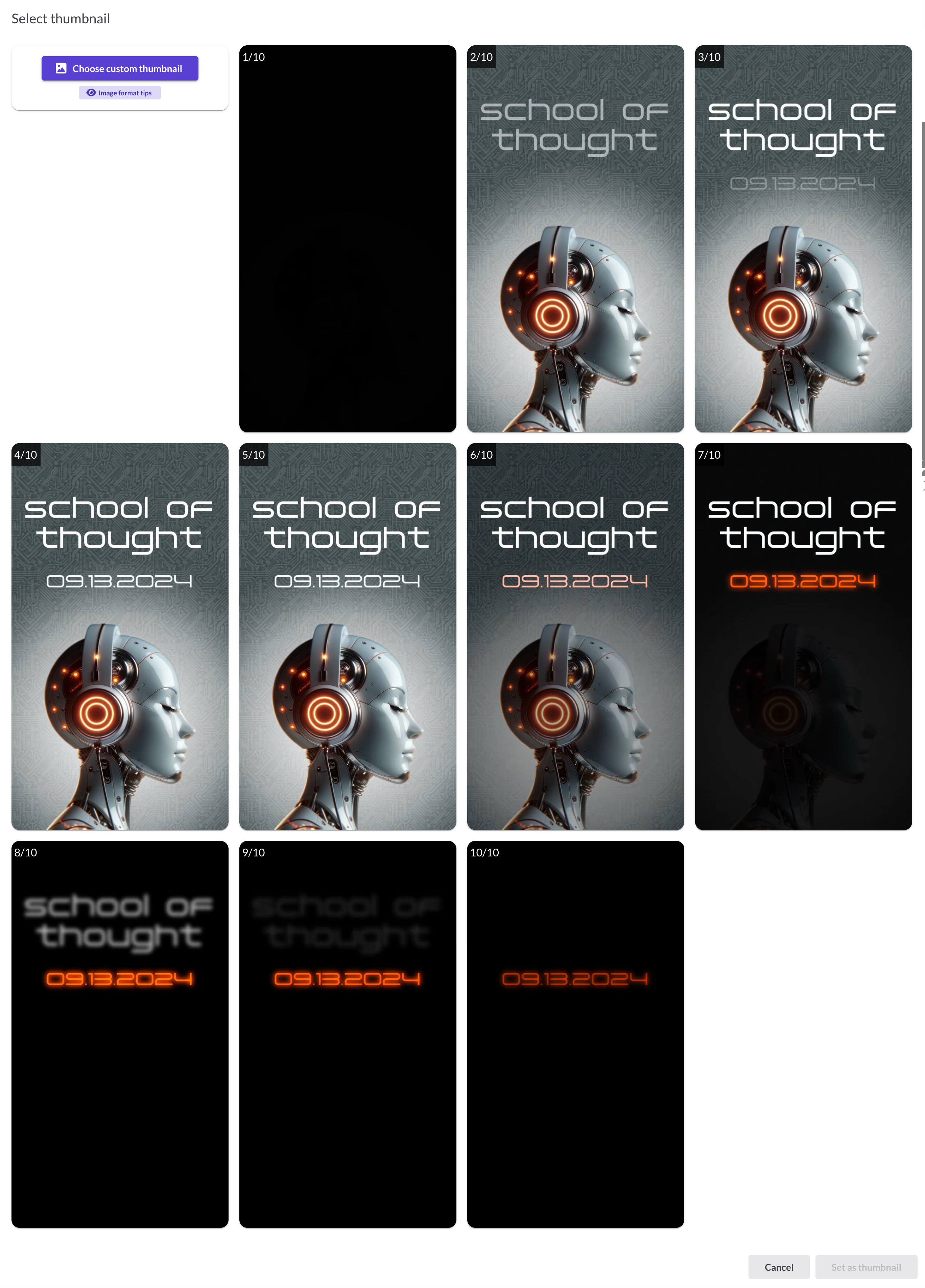 - Choose thumbnail: Pick from automatically generated thumbnails or upload a custom image