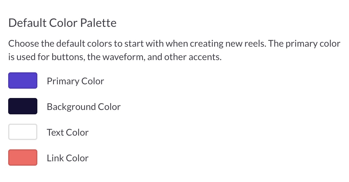 The color palette controls the visual style of your reels. You can set defaults for four colors: