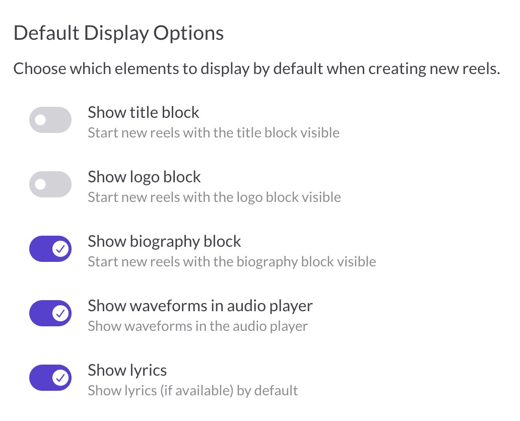 If you've saved reel templates, you can choose one as your default. New reels will start with that template's theme settings, block order, and visibility settings.