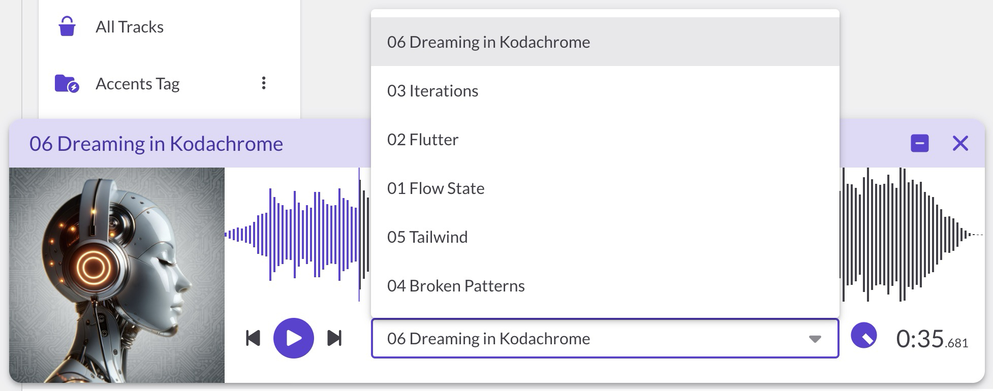 - Track selector: When multiple tracks are queued, a dropdown appears so you can jump to any track