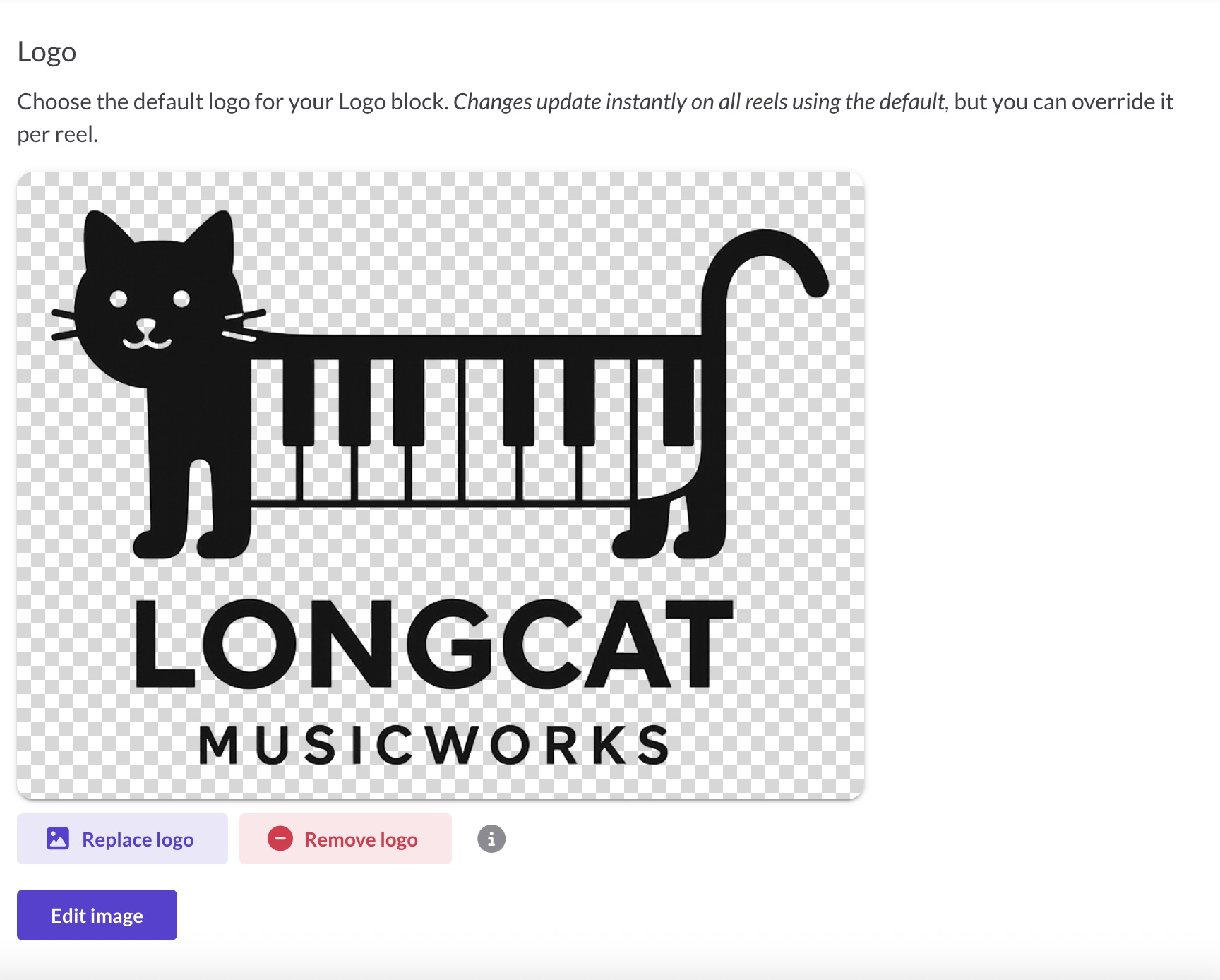 The Logo block displays your logo image. You can set a default logo in Reel Settings that pre-populates on every new reel, then resize, override, or hide it when needed.