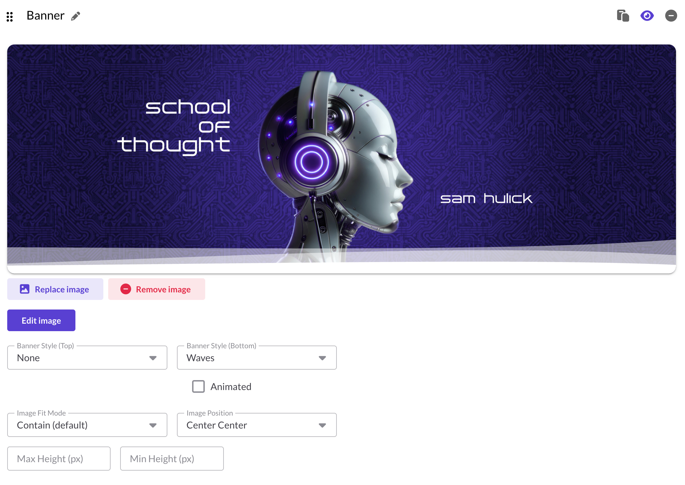 - Cover: Fills the entire banner area, cropping as needed. Best for photos where some cropping is acceptable. This mode offers the most flexibility when used with Min/Max Height settings (see below).