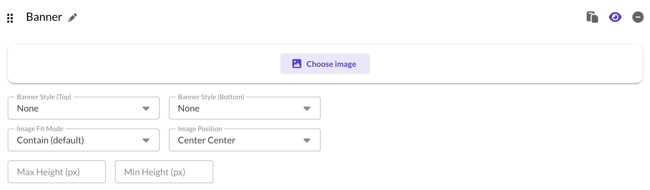 Min Height prevents your banner from becoming too thin on mobile. A value of 200–250px keeps it looking good on small screens. Max Height caps how tall the banner can grow on large monitors. These settings work best when using Cover fit mode.